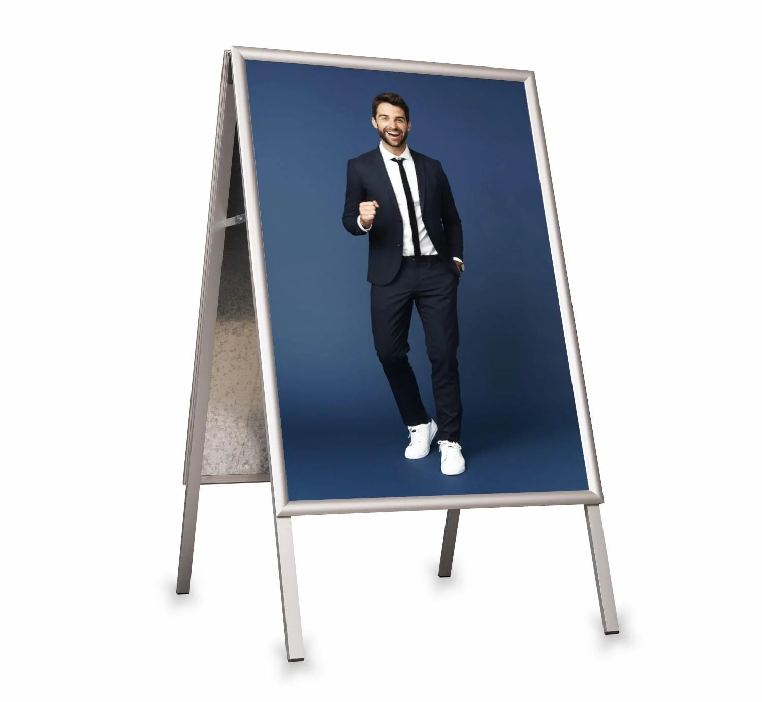 Aurora A-board sign, renowned and highly popular on a number of markets. This produktas is an exceptionally solid and durable sistema, made entirely of metal. Its back is made of galvanised plienas plate. Thanks to this, the sign can be used outdoors, but in limited wind conditions. A snap frame sistema allows to put a poster inside. That takes only few seconds. A thick poster cover is equipped with UV-filter protecting the maketas from sunlight and fading colours. The snap frame of the sign is made of 25 mm anodized aliuminis profile.
