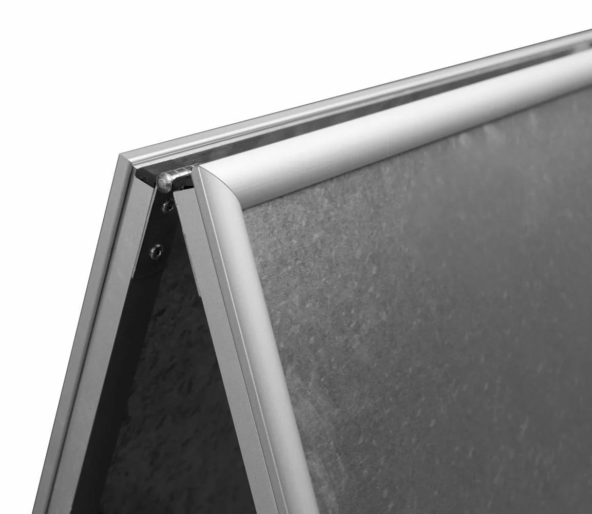 Aurora A-board sign, renowned and highly popular on a number of markets. This produktas is an exceptionally solid and durable sistema, made entirely of metal. Its back is made of galvanised plienas plate. Thanks to this, the sign can be used outdoors, but in limited wind conditions. A snap frame sistema allows to put a poster inside. That takes only few seconds. A thick poster cover is equipped with UV-filter protecting the maketas from sunlight and fading colours. The snap frame of the sign is made of 25 mm anodized aliuminis profile.