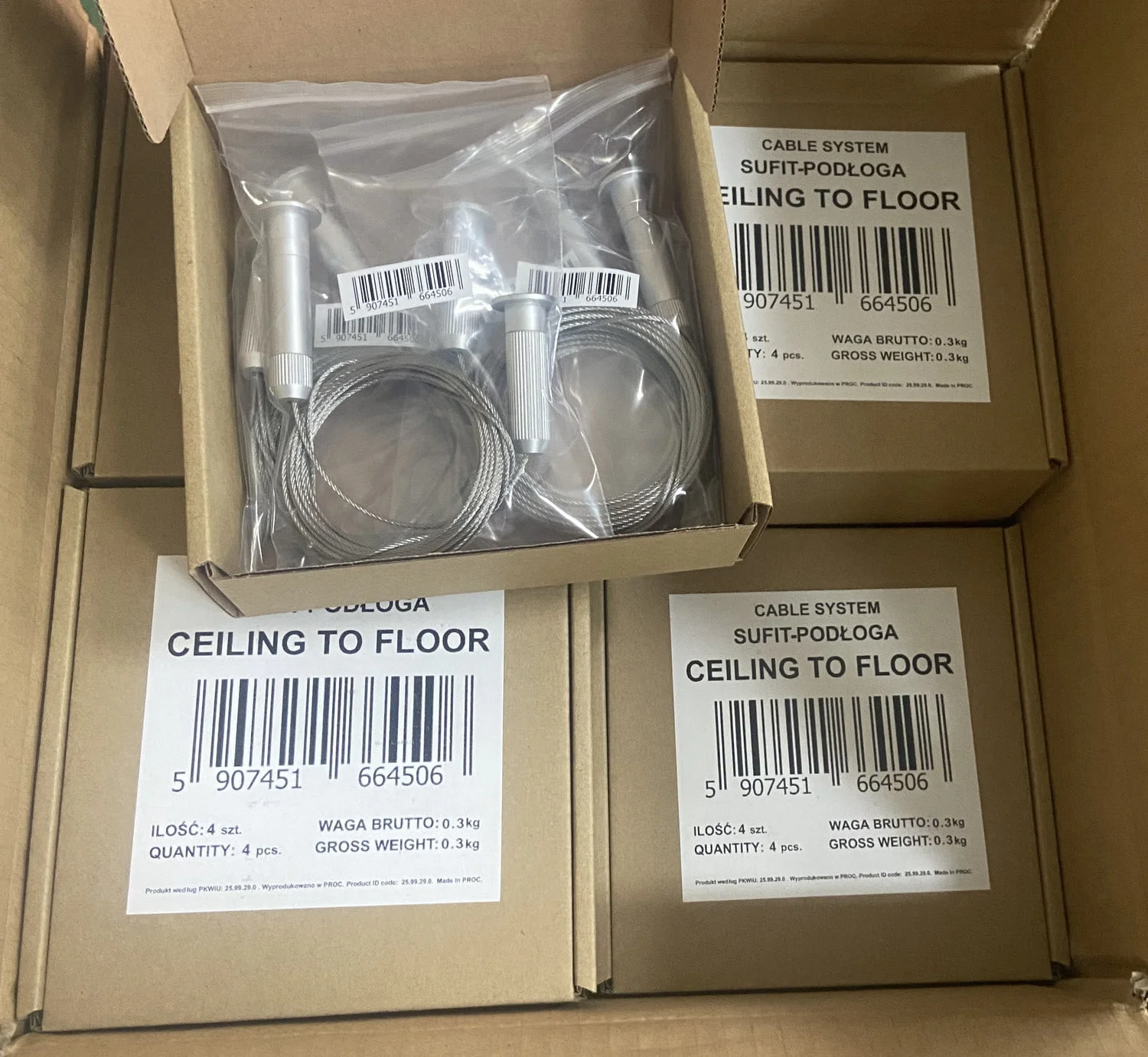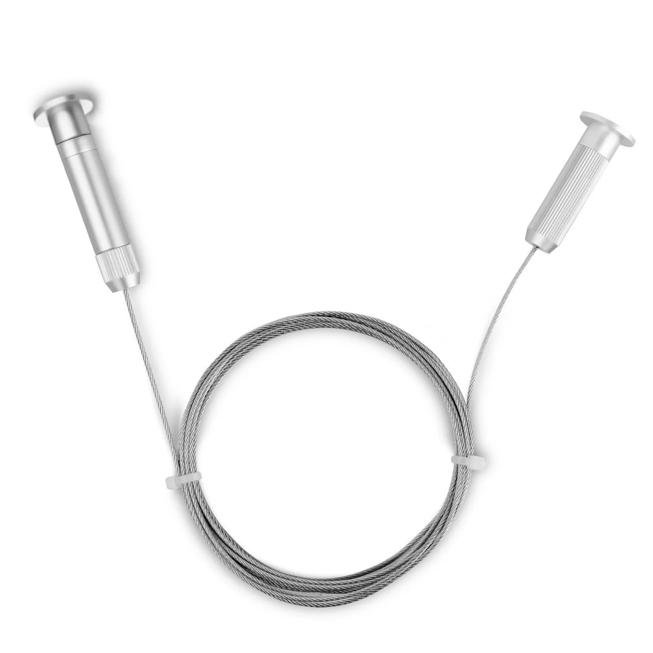Šiame rinkinyje yra: 2 aliuminio laikikliai ir 400 cm ilgio plieninė virvė.