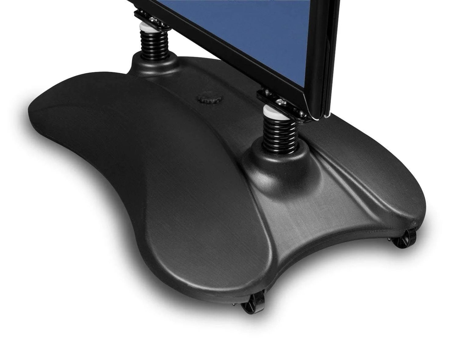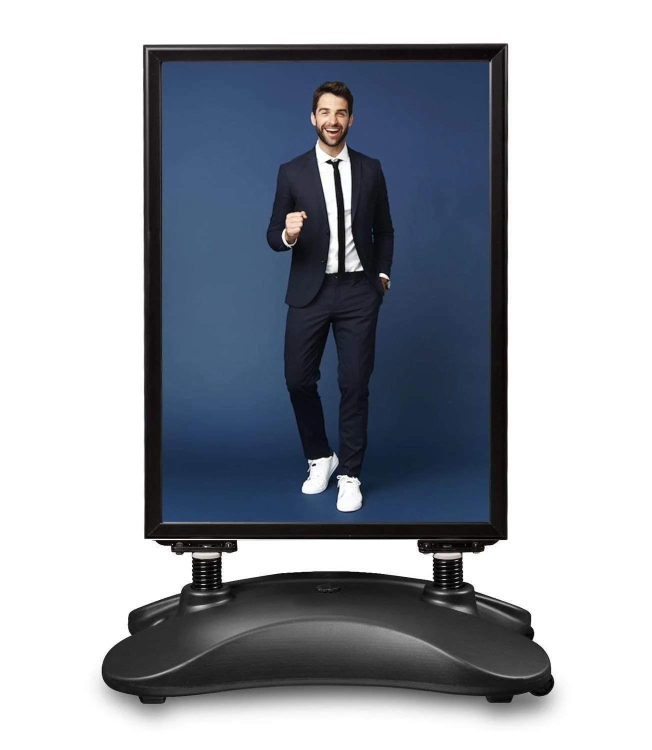 By far the most popular outdoor pavement sign. The frame is mounted on springs, thanks to which the sign adjusts to the wind. The base is a water tank. Once filled up, it makes the sistema very heavy. It may be handled, though, by a handle and wheels installed at the base. A snap frame allows to insert/exchange a poster within few seconds. A thick poster cover is equipped with UV-filter protecting the maketas from sunlight and fading colours.