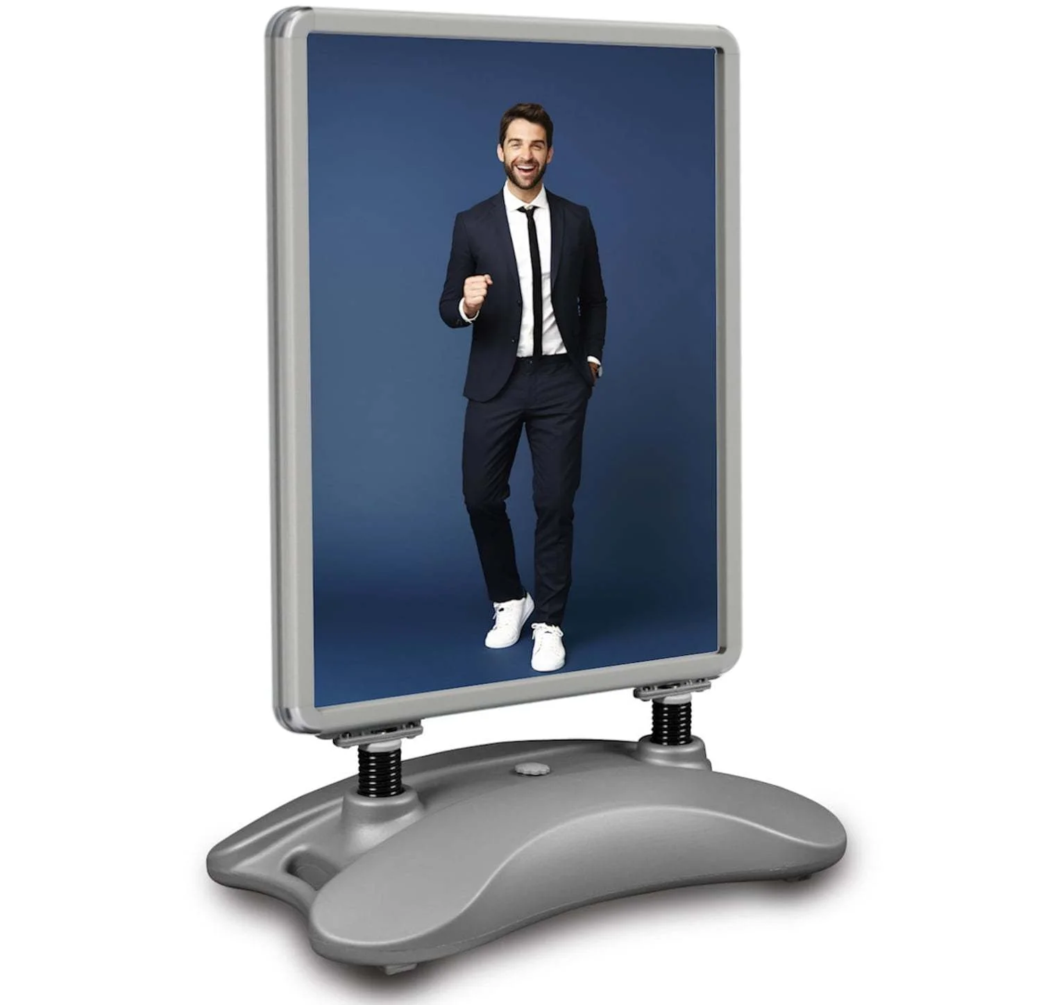 By far the most popular outdoor pavement sign. The frame is mounted on springs, thanks to which the sign adjusts to the wind. The base is a water tank. Once filled up, it makes the sistema very heavy. It may be handled, though, by a handle and wheels installed at the base. A snap frame allows to insert/exchange a poster within few seconds. A thick poster cover is equipped with UV-filter protecting the maketas from sunlight and fading colours.