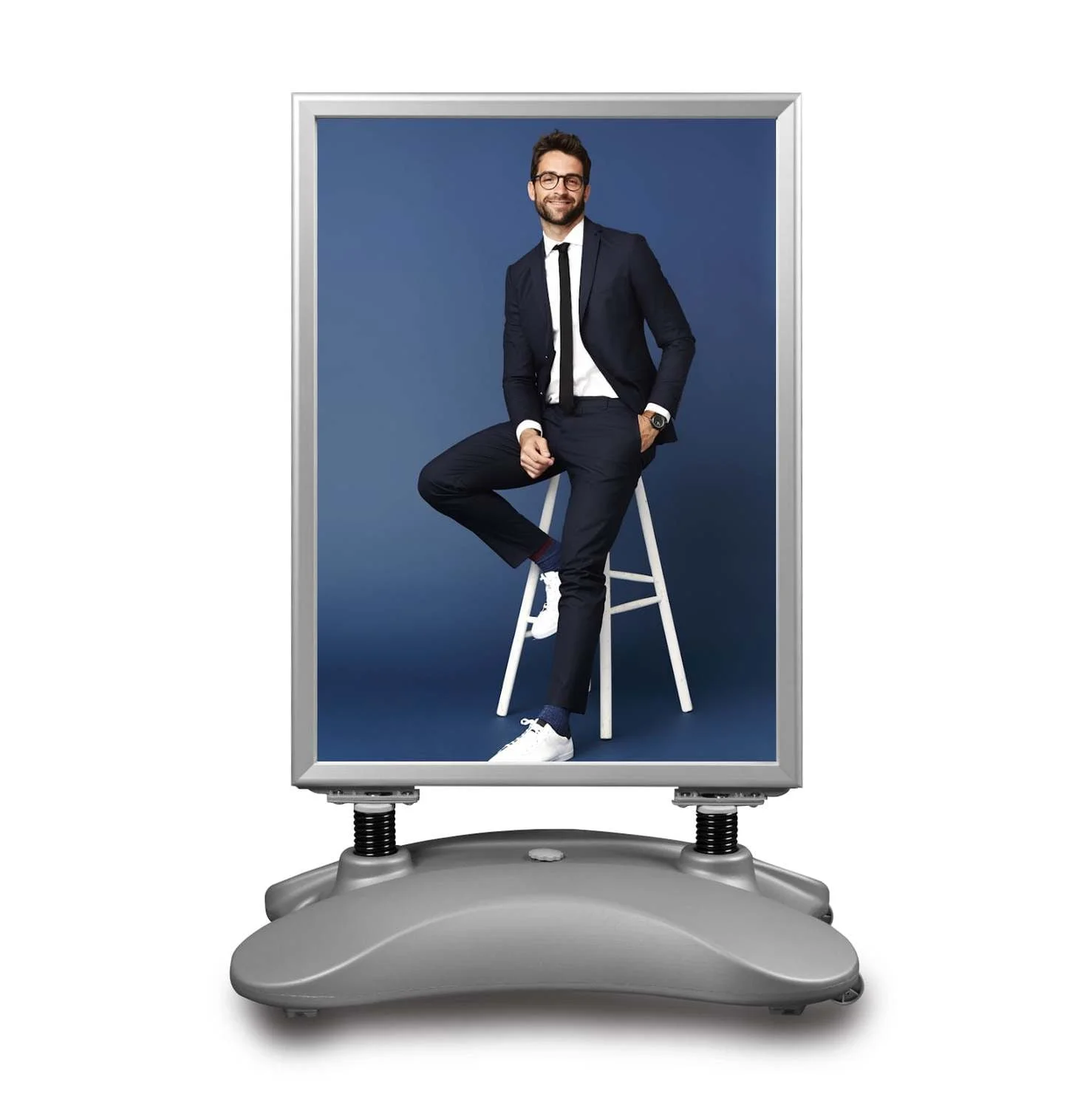 By far the most popular outdoor pavement sign. The frame is mounted on springs, thanks to which the sign adjusts to the wind. The base is a water tank. Once filled up, it makes the sistema very heavy. It may be handled, though, by a handle and wheels installed at the base. A snap frame allows to insert/exchange a poster within few seconds. A thick poster cover is equipped with UV-filter protecting the maketas from sunlight and fading colours.