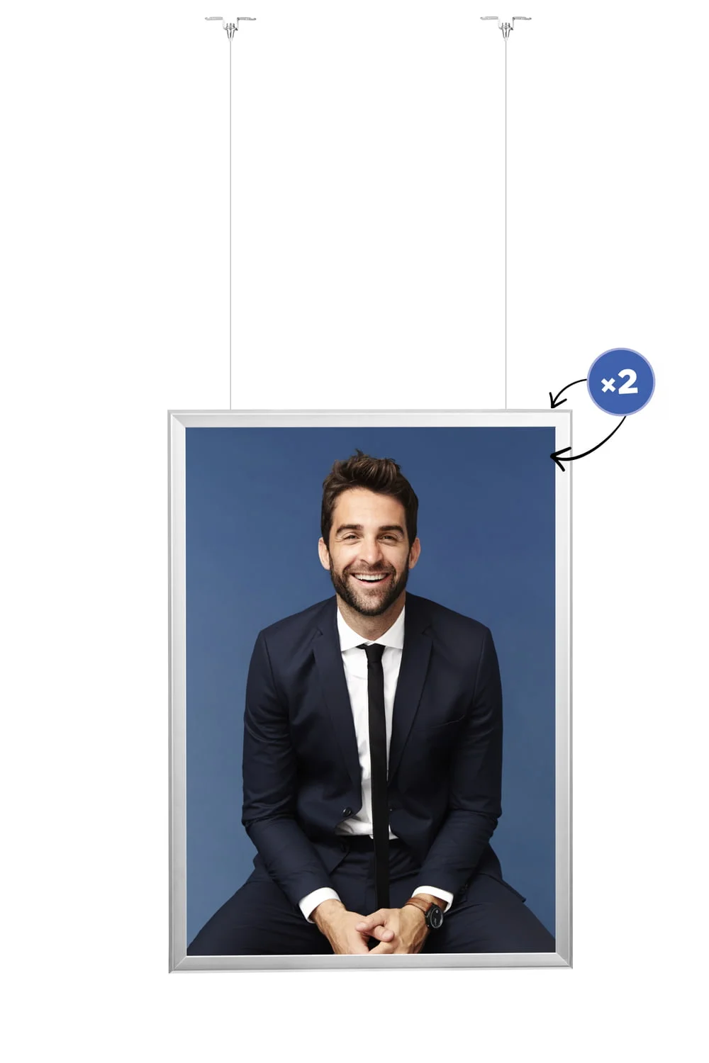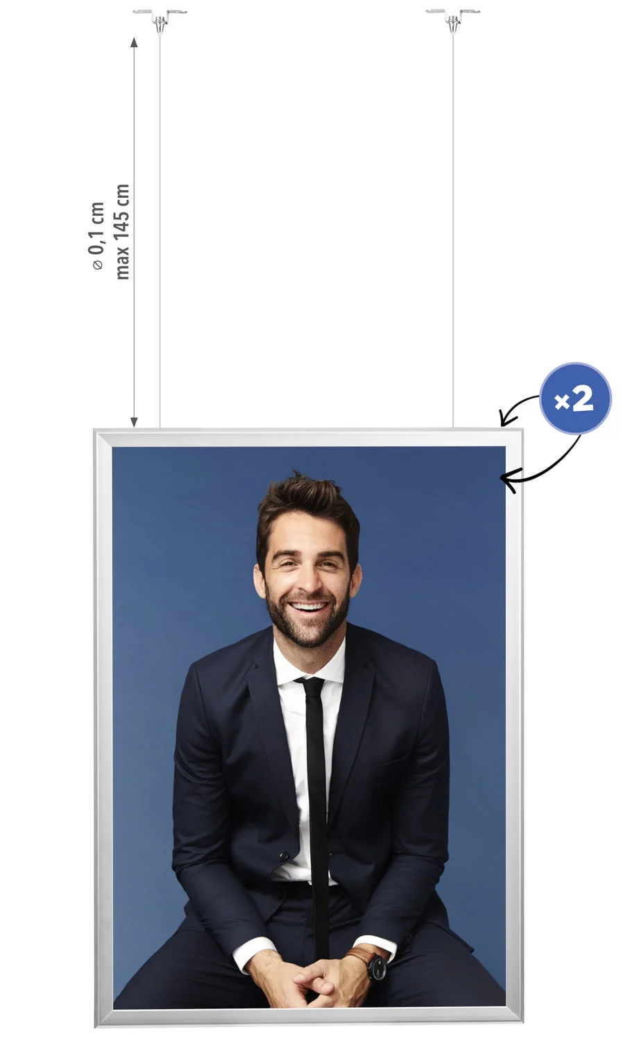A perfect solution for large stores and shopping malls. This Premium klasės type frame will allow for the pateikimas of graphics on both sides. The „clip-clap” sistema is a quick and trouble-free replacement of the poster, which takes a few seconds. A strong, plienas cable guarantees safe and stabilus suspension of the frame. The set includes brackets for mounting the frame on the ceiling.