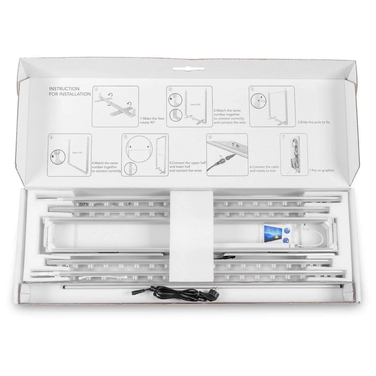 Several dozen LED bulbs guarantee a unique and amazing effect of presented graphics. High quality, easy assembly and long life are ensured by solid aliuminis frame and silicone tape mounted maketas. The sistema is packed in a sturdy cartboard case, making it much easier to store and transport.