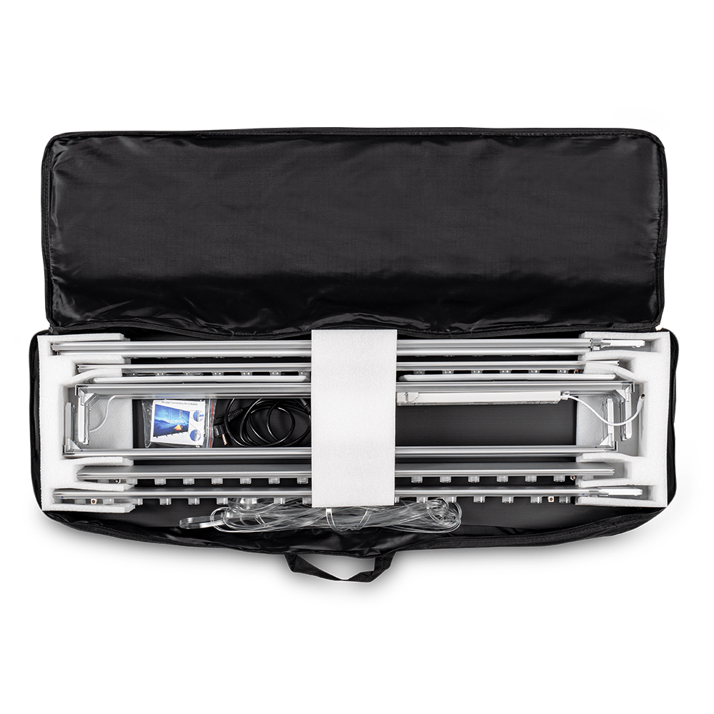 Several dozen LED bulbs guarantee a unique and amazing effect of presented graphics. High quality, easy assembly and long life are ensured by solid aliuminis frame and silicone tape mounted maketas. The sistema is packed in a sturdy cartboard case, making it much easier to store and transport.