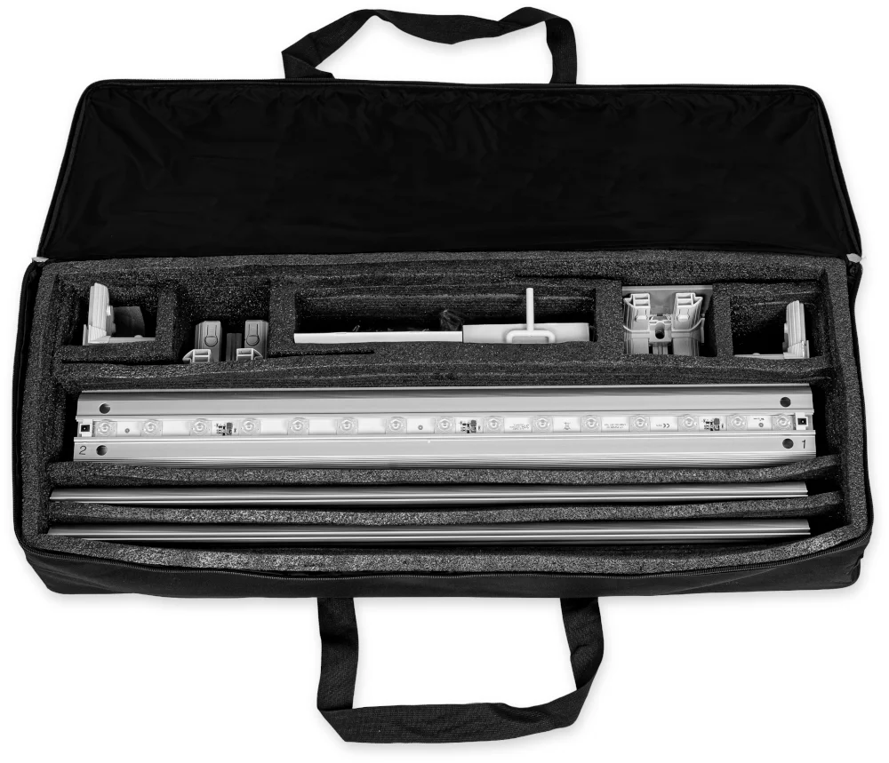 Stendas supakuotas į transportavimo krepšį su ratukais, todėl jį lengva transportuoti ir sandėliuoti.