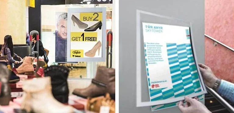 Magnetic frames are a modern method of presenting information. They are gaining more and more popularity due to their aesthetics and simplicity of use. Just stick the frame to any surface (using transparent adhesive to be applied on the frame) and it is ready for use. Glossy anti-reflective foil holds the maketas with magnetic strips attached to it and to the frame. To replace the poster, simply lift the front film up. The frame will close by itself thanks to the attracting magnets.