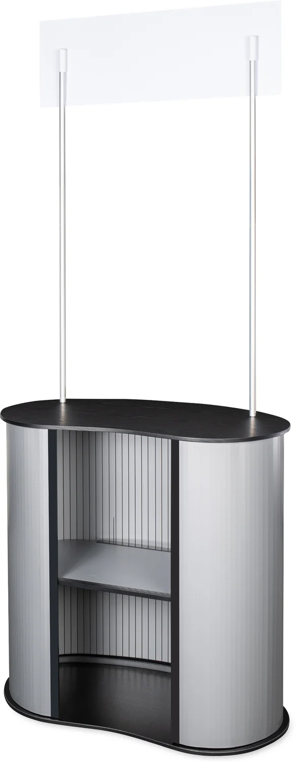 The walls of this sistema are made of cellular PVC, mounted to the tabletop and base with velcro straps. Thanks to the simple design, assembling and disassembling does not require tools and literally takes a few seconds. High quality, stability and long life of this counter are ensured by a wooden base and strong, wooden table top.