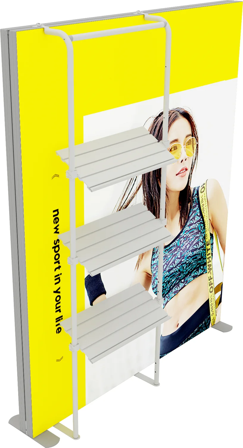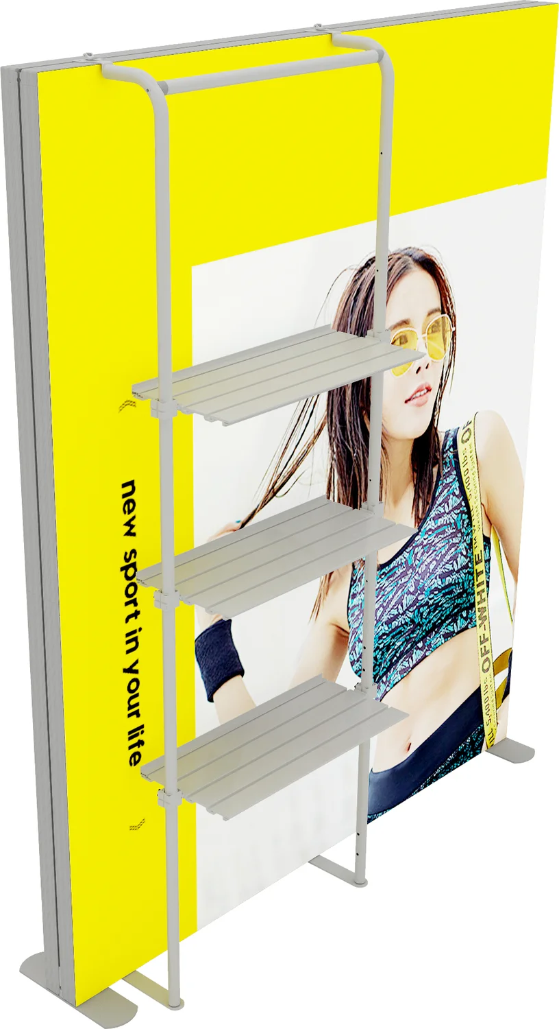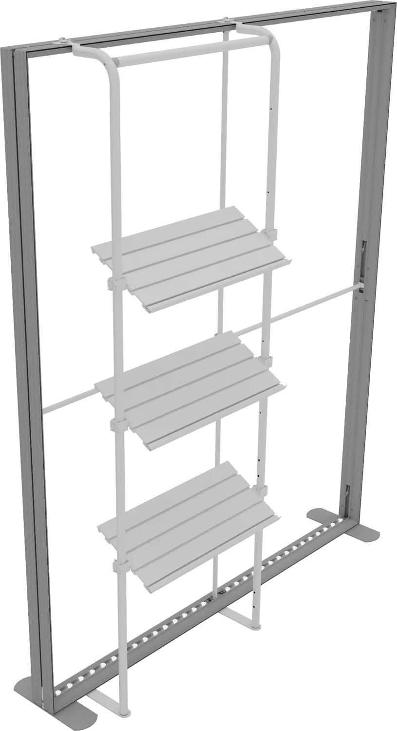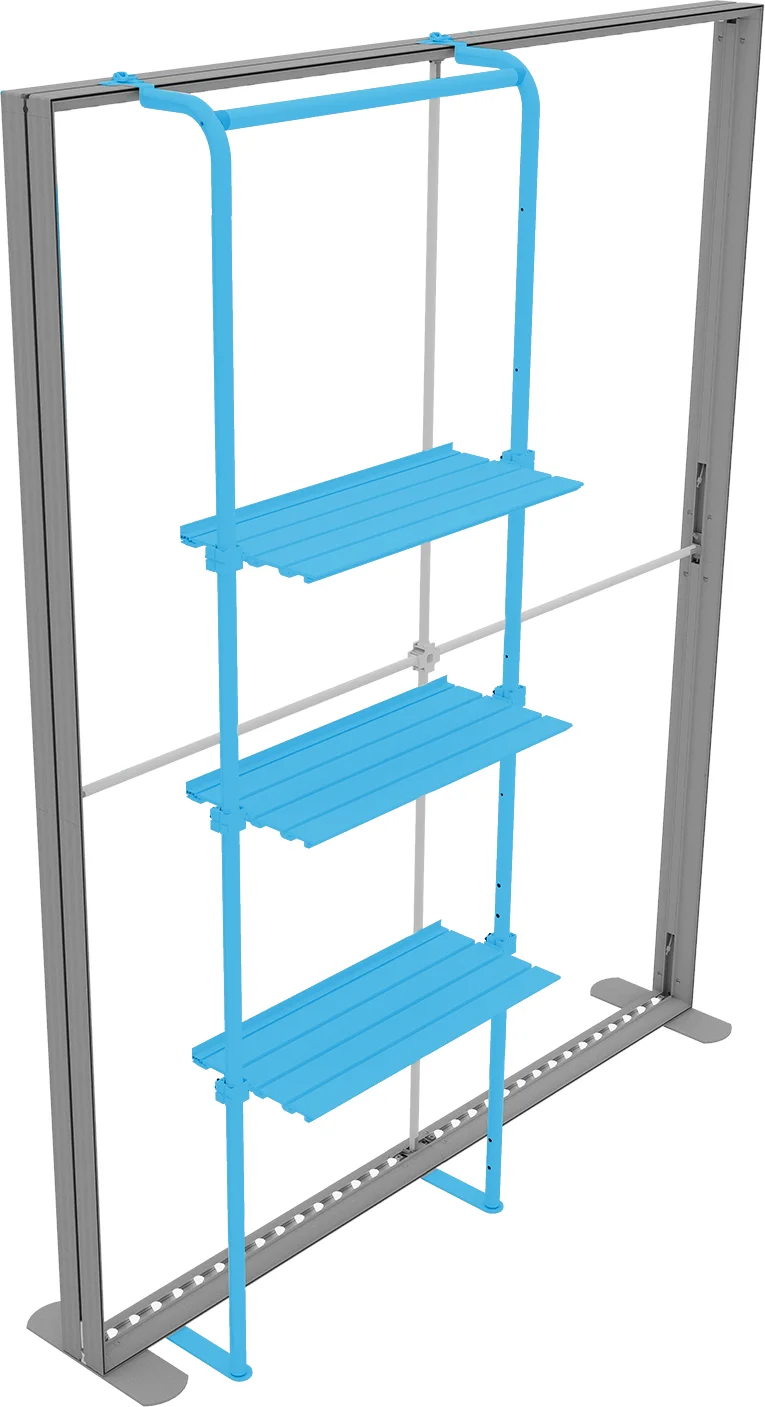Sistema susideda iš 3 baltų plastikinių lentynų, kurias galima montuoti horizontaliai arba įstrižai. Specialūs kraštų ribotuvai neleidžia eksponuojamiems produktams nuslysti nuo lentynų. Lentynos prie rėmo tvirtinamos naudojant rinkinyje esančius jungtukus.