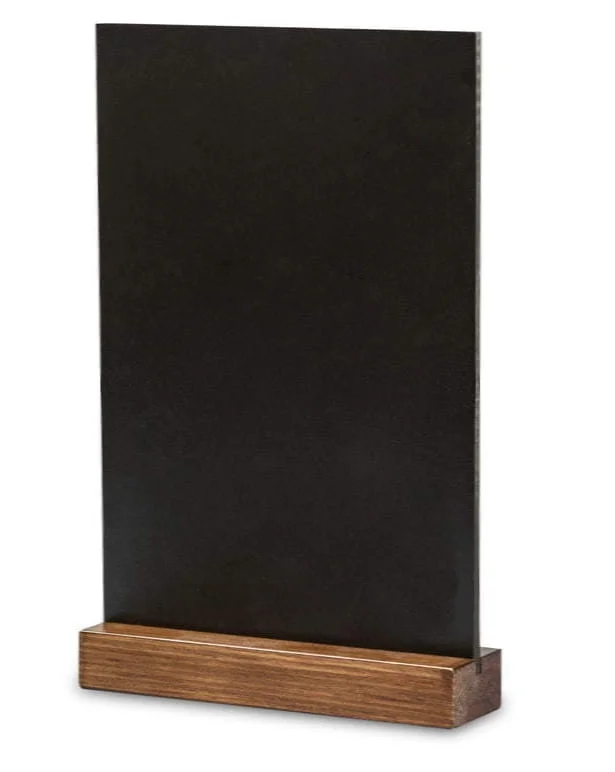 The double-sided, thick chalk display stand is ideal for placing on a table/counter in various public spaces, e.g. restaurants, banks, hotels, etc. The chalk board ensures easy change of the presented information. The wooden base guarantees stability and an elegant look.